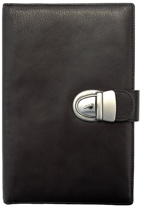 Features: Full grain Italian-style cowhide leather. Black moiré lining. Elastic pen loop (no pen included). Choice of journal, calendar or address book insert included.